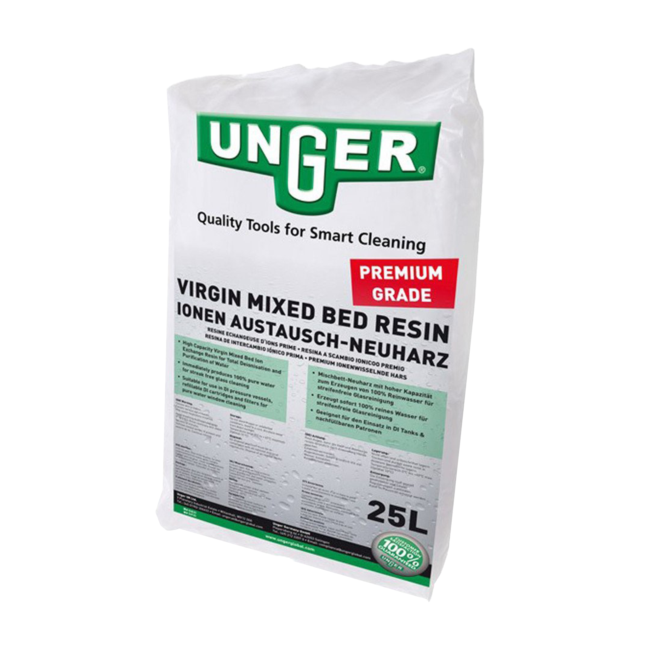 Für UNGER DI Filter Bestehend aus einer Mischung eines Gels, Typ I starker basischer Anionenaustauscher, und eines Gels, starkes Säure-Kationenharz, für die direkte Entmineralisierung von Wasser. 40 % Kation, 60 % Anion. pH-Bereich 0-14.